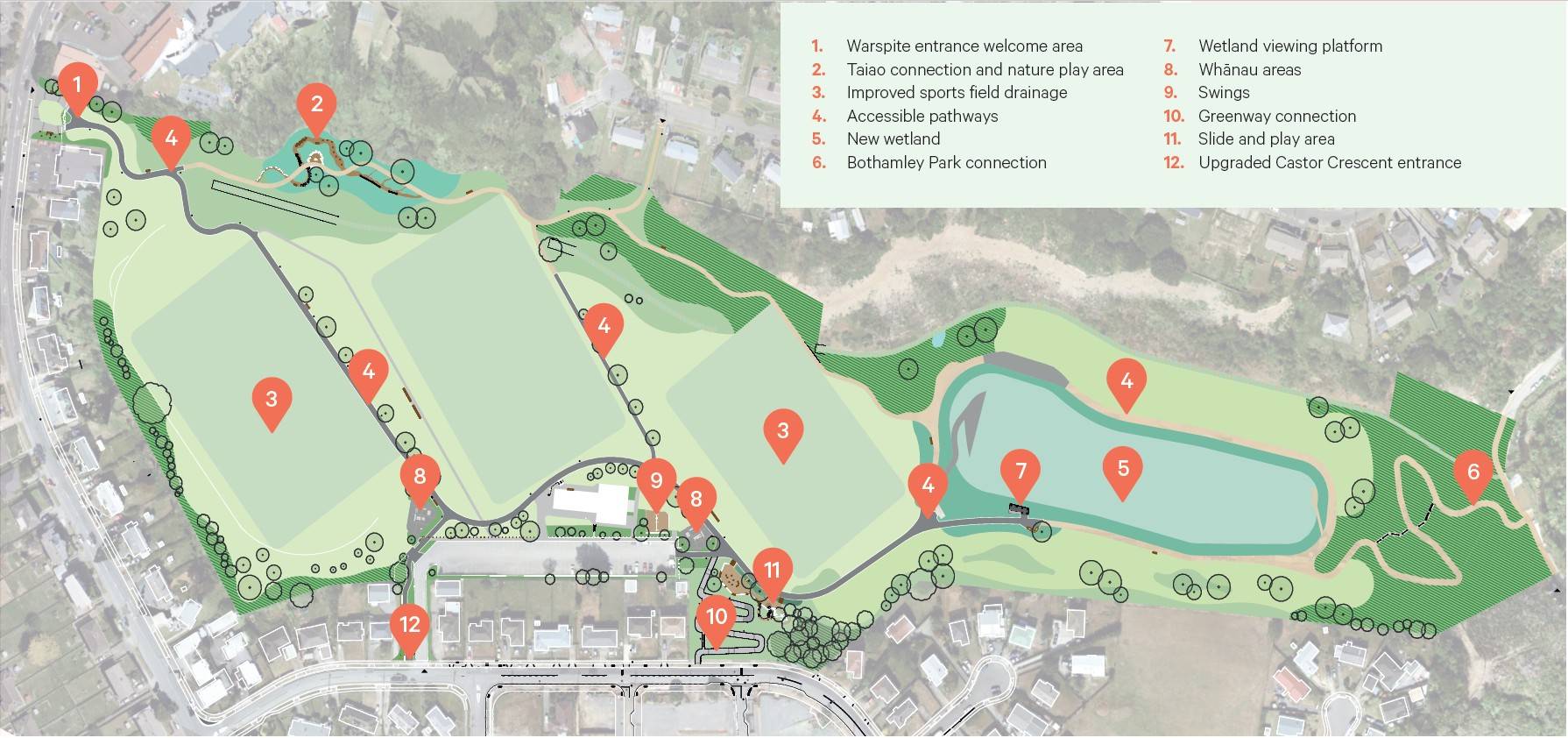 Improving te taiao (the environment) is a priority for eastern Porirua, and this project will help us achieve it. When work is completed in late 2027, the upgraded park will include: